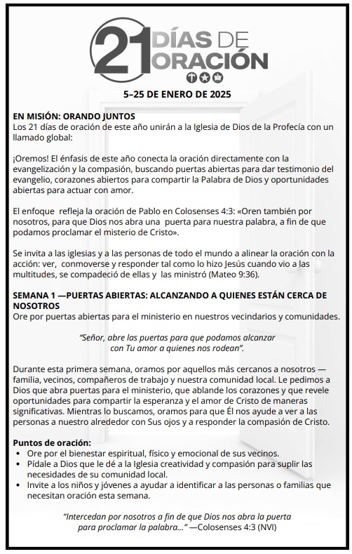 Durante los últimos 20 años (gloria a Dios), la familia global de la Iglesia de Dios de la Profecía ha sido llamada a comenzar el Año Nuevo con una temporada de ayuno y oración. Los 21 Días de Oración de 2026 unirán a la Iglesia de Dios de la Profecía en torno al llamado global a vivir y orar “En Misión”.